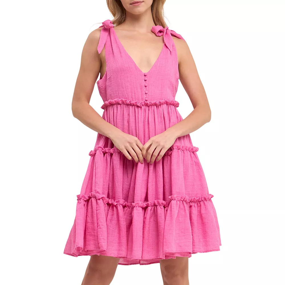 This 3 Tiers Tie Shoulder Mini Dress is the perfect way to show off your shoulders. The V-neck and ruffle detailing makes this dress both flirty and fun. The tie shoulder straps add a touch of femininity.