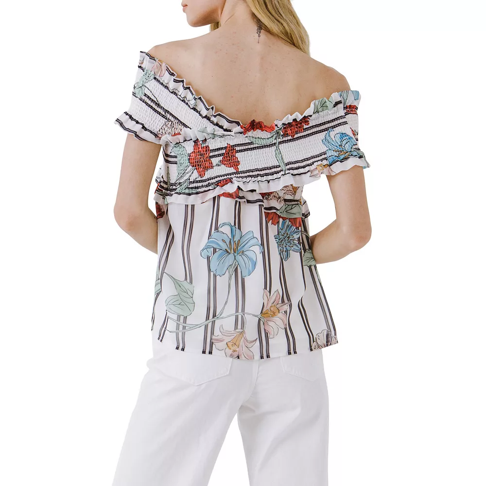 The Amelie Stripe Print Off Shoulder Top is a flirty, feminine top that is perfect for a day out. The off-shoulder design is accented with smocked details and overlap details. The babydoll style of this top is perfect for showing off your figure.