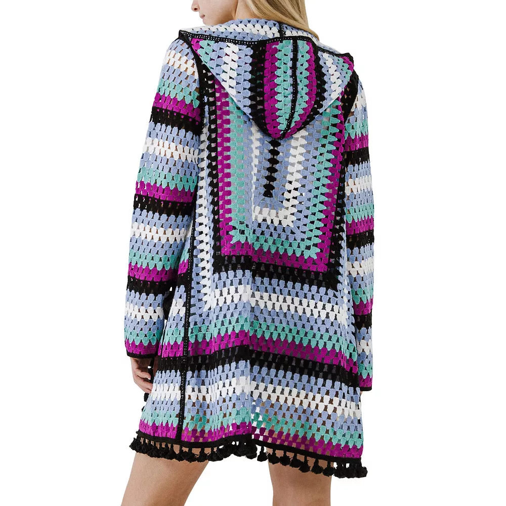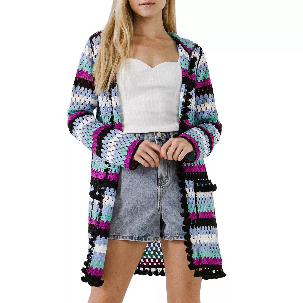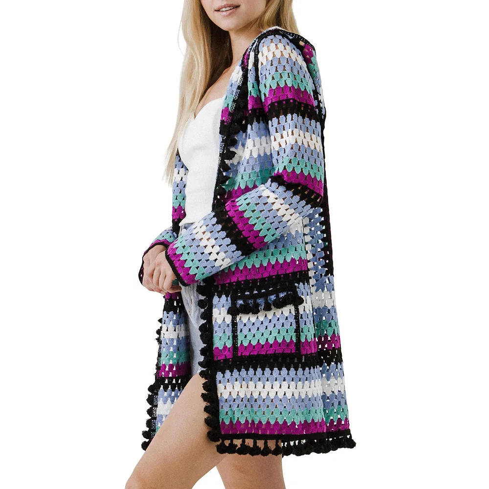 Introducing the Crochet Cardigan! This gorgeous cardigan comes with pompom trim and pockets, making it the perfect choice for a cozy night in or a day out on the town. The hooded cardigan is crochet knitted and sure to keep you warm all season long. Choose from a variety of colors to find the perfect match for your wardrobe.