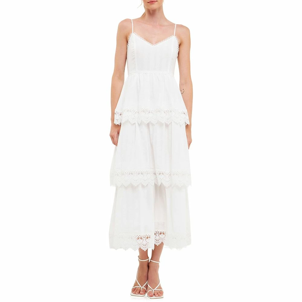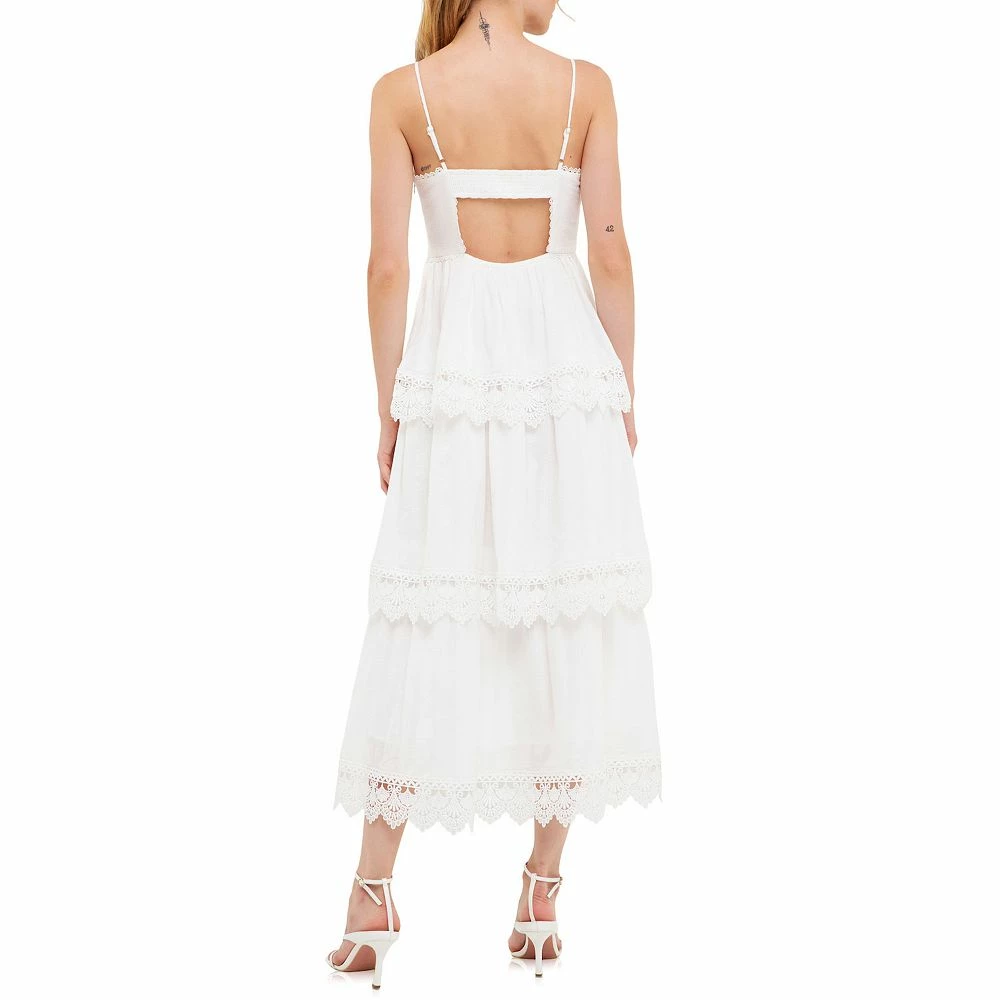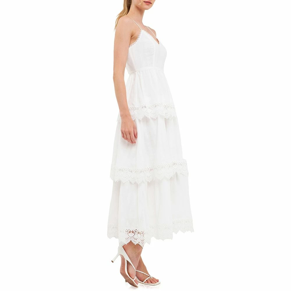 This maxi dress is perfect for any event this season. With beautiful floral lace detailing and a tiered trim this maxi dress is simply stunning. It also features a side zipper and back smocking for a perfect fit. With its classic silhouette and beautiful details this maxi dress is sure to turn heads at your next special event.