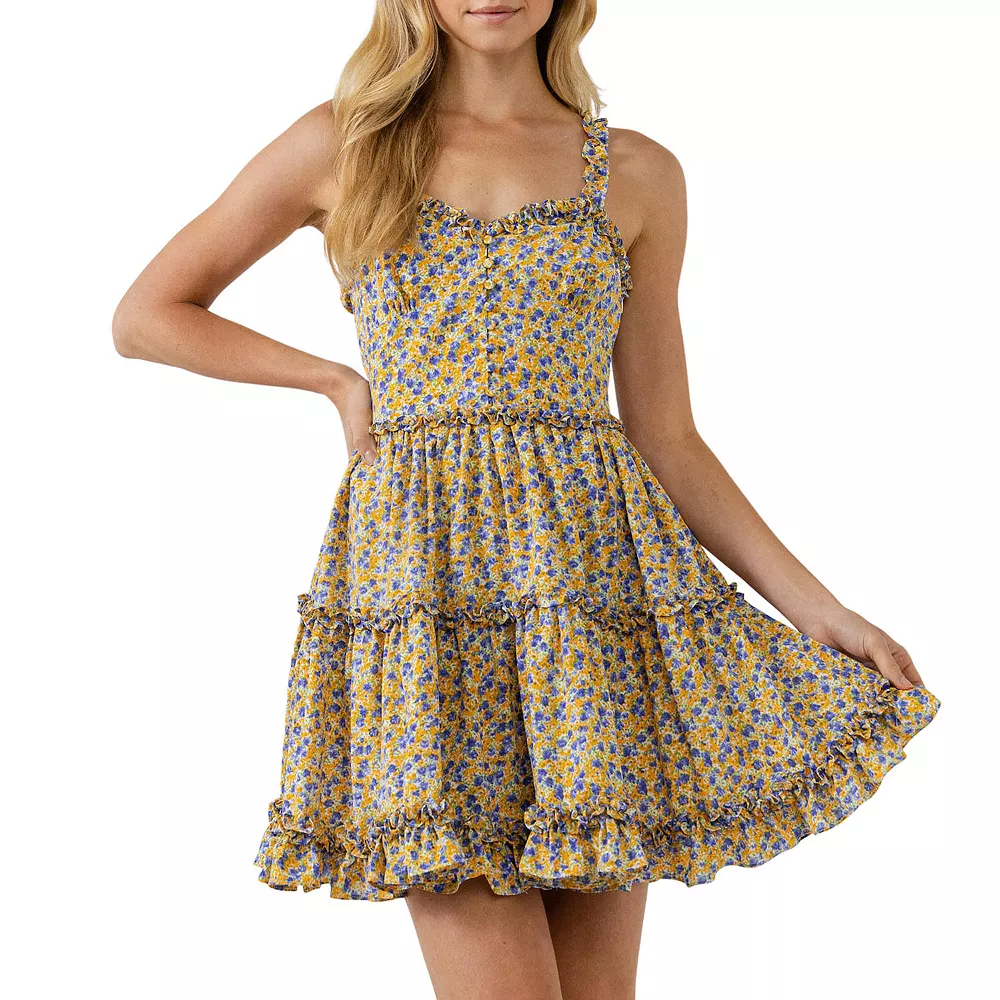 Pretty in prints. This mini dress comes in a swirling floral motif with ruffle details along the hemline. Sleeveless and fitted with shoulder straps it has a lined bodice for a smooth comfortable fit. Slip it on and get ready to take on the day – or night.
