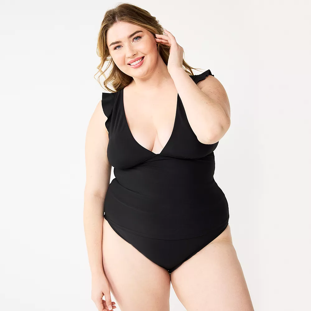 Soak up the sun by the pool or at the beach in this women’s ruffled strap tankini top by Freshwater.