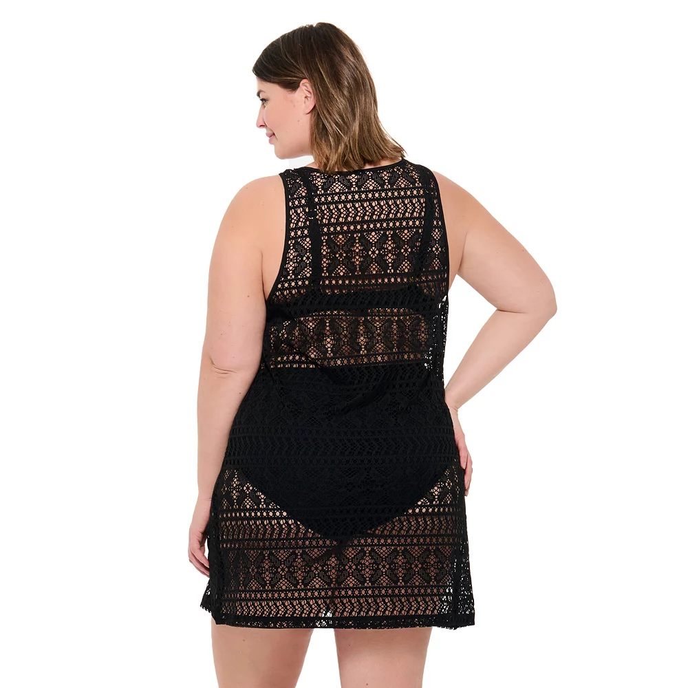 A sheer crochet design makes this women’s plus size Freshwater swim cover-up dress a great poolside choice.