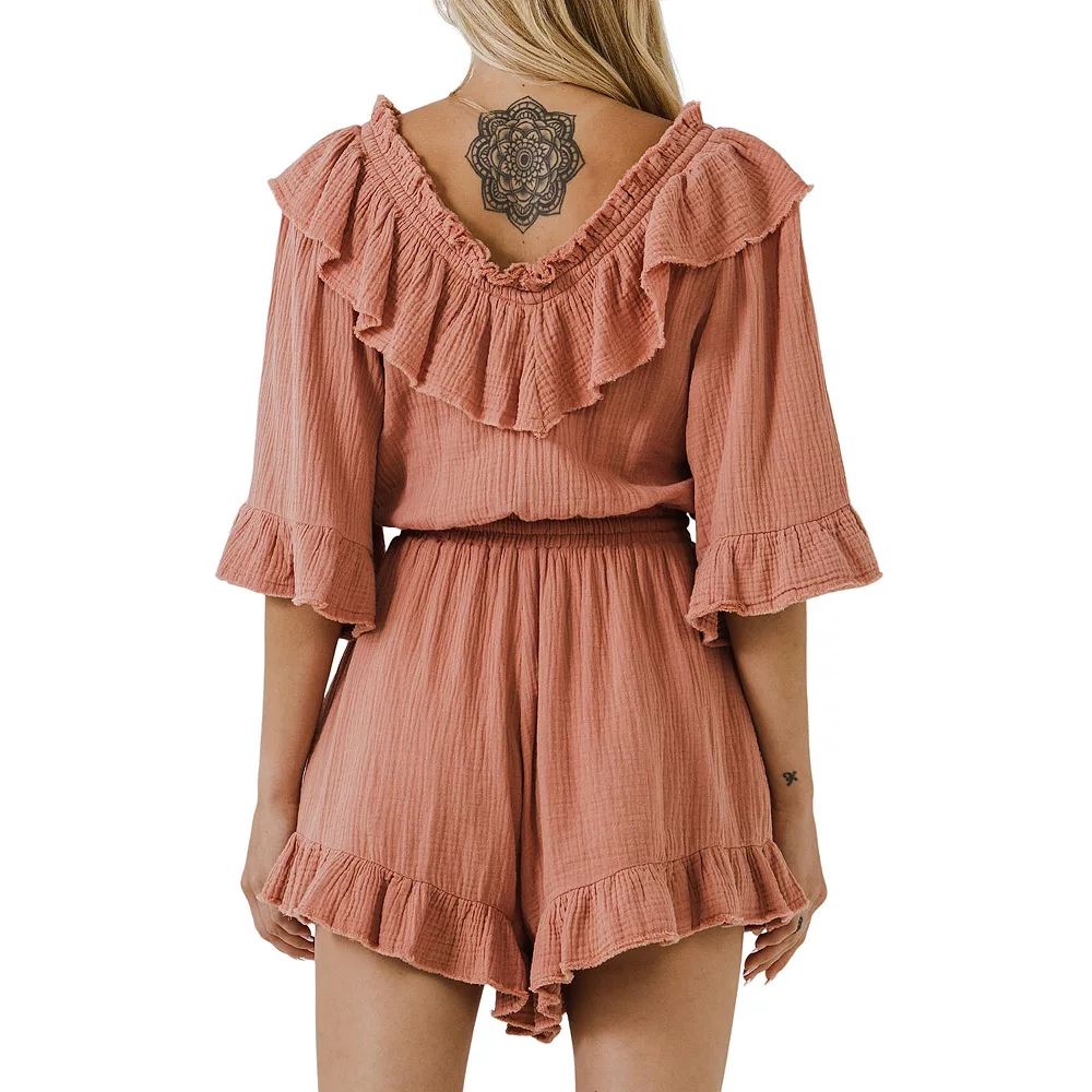 So pretty so playful. The Ruffle Romper features a Vneckline waist strap and ruffles at the legs. It’s made with our ultrasoft material and has raw edge details. Trust us you’ll want to live in this romper all summer long.