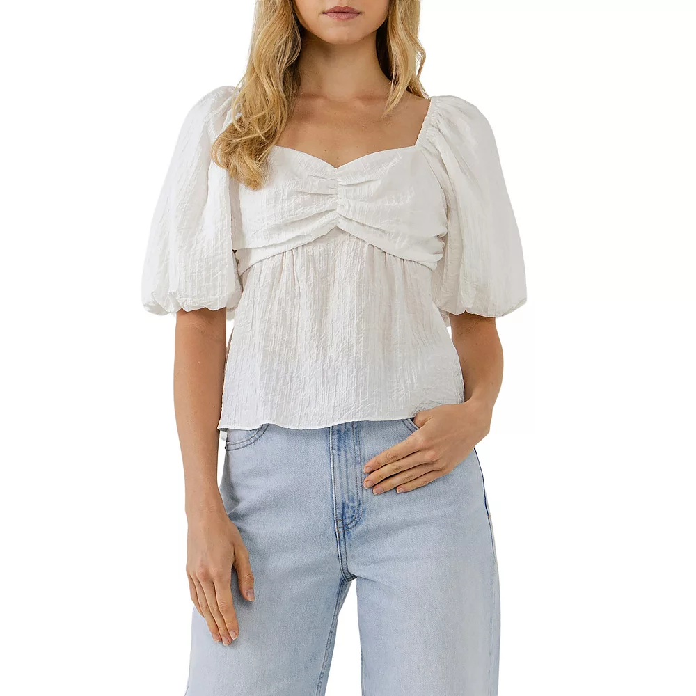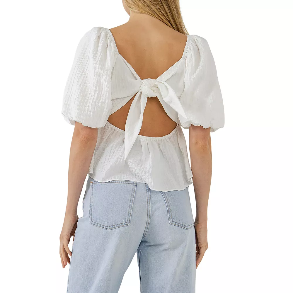 This top is perfect for date night. The textured fabric and tie detail at the back give this top an extra touch of femininity and romance. The puff sleeves and sweetheart neckline add the perfect amount of drama. You’ll definitely turn heads in this show-stopping top.